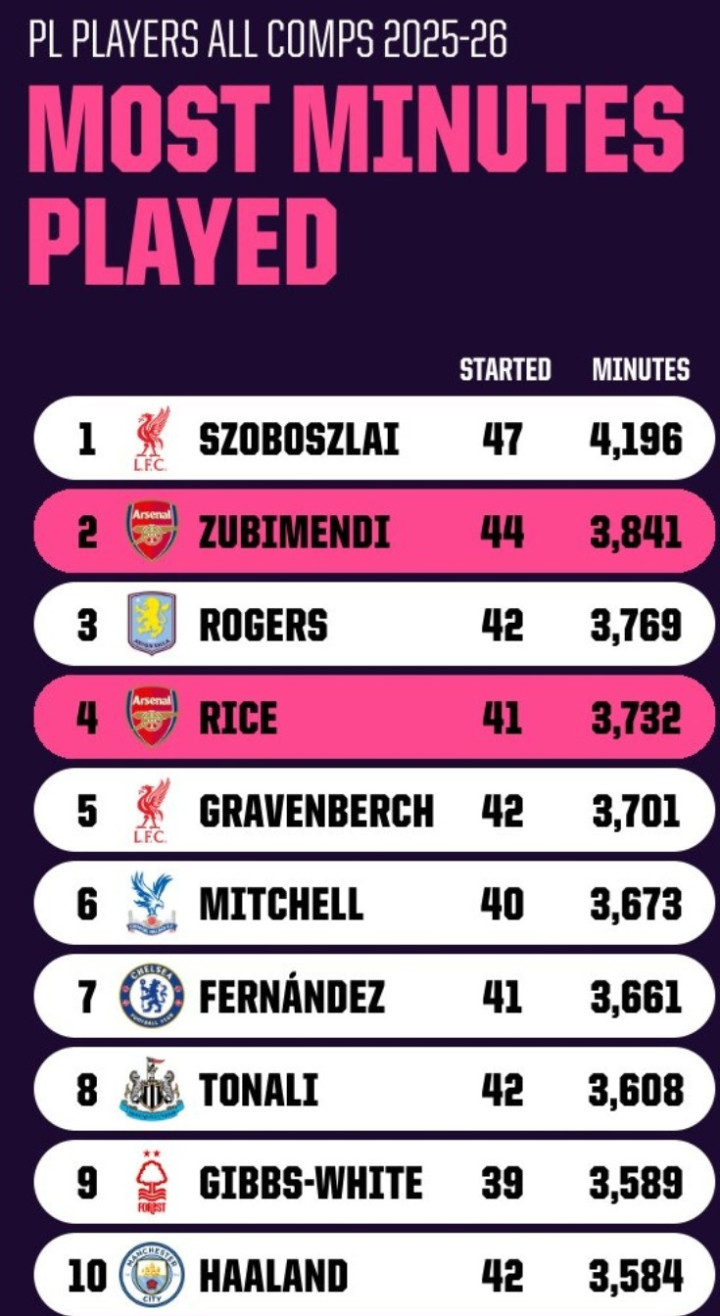 直播吧4月17日讯OPTA对英超球员本赛季各项赛事出场时间进行了统计,利物浦的索博斯洛伊以4196分钟居首,阿森纳两将苏维门迪和赖斯位居第2和第4位,两人出场时间分别为3841分钟和3732分钟。